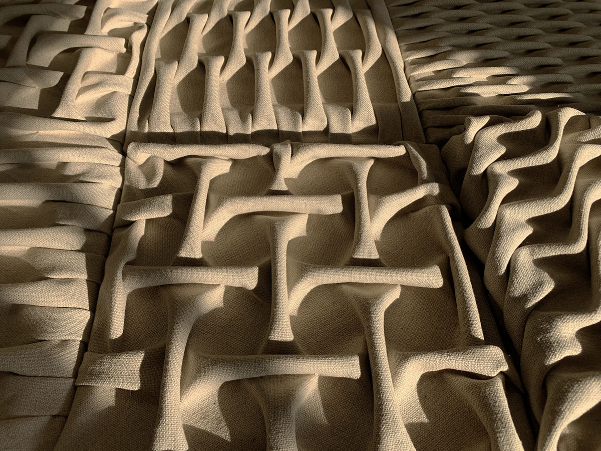 30cm角のタイル状の音響パネル8個に、スモッキングという伝統的な裁縫技術で加工したヘンプの生地を張り付け、それぞれ異なる模様を持つタイルをハート型に配置しマグネットで脱着する。
