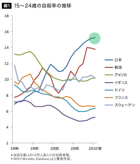 日本の若者(15才〜24才)の自殺率は、この20年間、これも先進諸国の中でダントツでトップです。欧米諸国は減少傾向にありますが、日本はその逆で増え続けています。