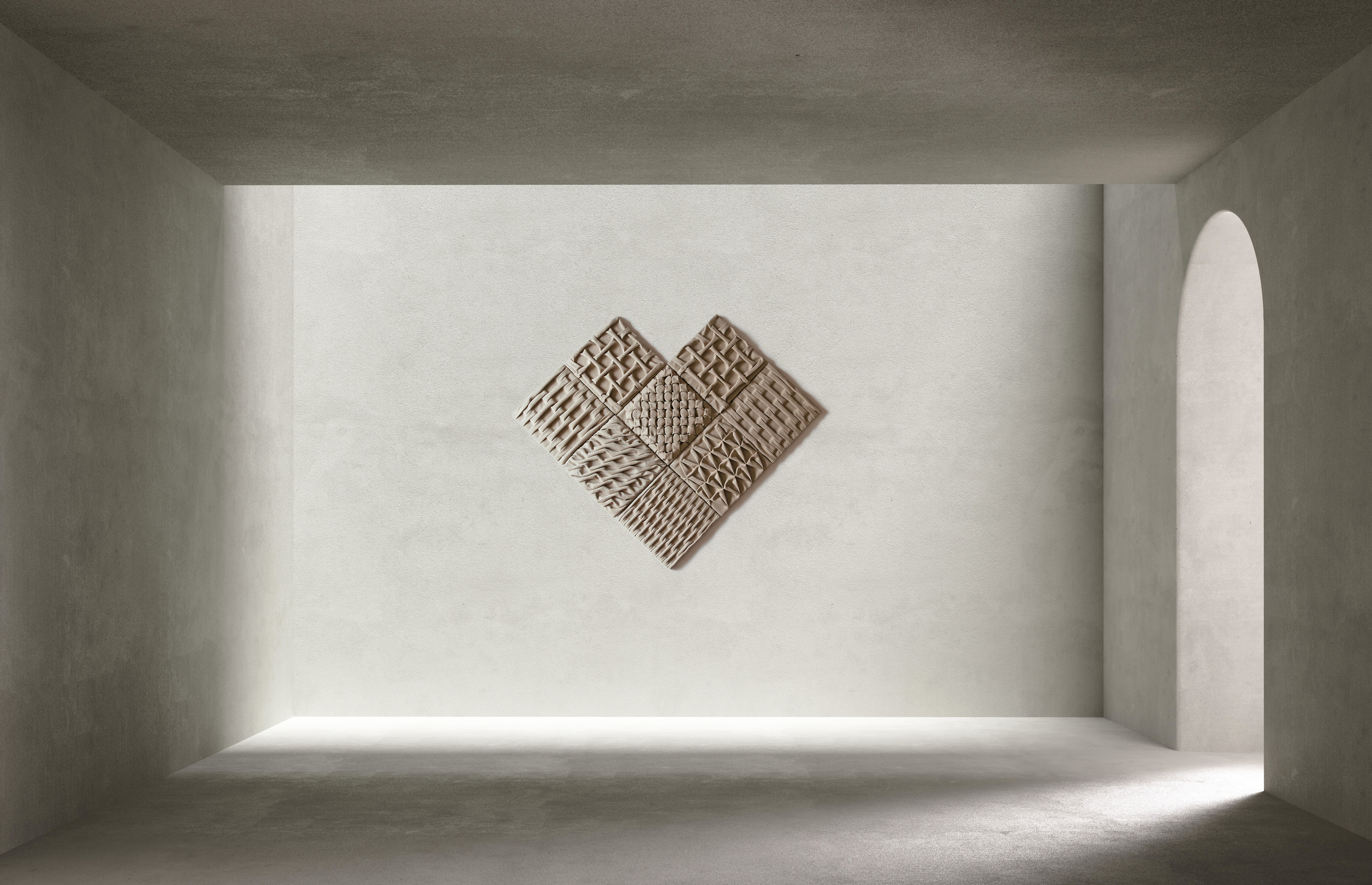30cm角のタイル状の音響パネル8個に、スモッキングという伝統的な裁縫技術で加工したヘンプの生地を張り付け、それぞれ異なる模様を持つタイルをハート型に配置しマグネットで脱着する。